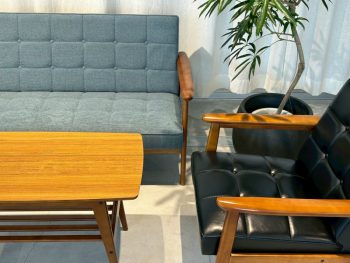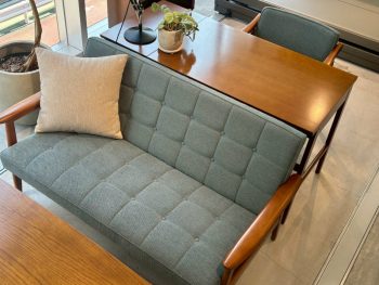 こちらはアサギ色を再現した「ノルデ・アサギ」という張地と定番のウォールナット色の木部を組み合わせ、「定番として、時代を超えて受け継がれていく」という意味が込められています。