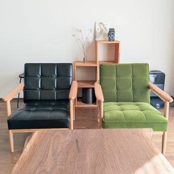 もともと憧れていたモケットグリーンは決まっていましたが、Kチェアにするかロビーチェアにするか迷いました。