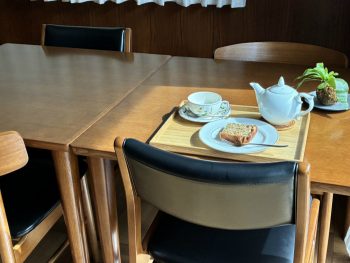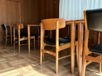 ずらっと並んだダイニングテーブル、Tチェアとアームレスダイニングチェアの組み合わせは古民家を活かしたお店とも相性がとてもよく、何度も訪れたことのあるような心地よい気持ちにさせてくれます。