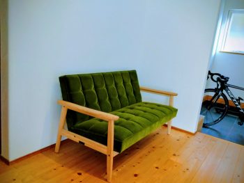 無垢の檜(ひのき)と漆喰の壁にこだわったシンプルな住まいですが、モケットグリーンの張地が美しいアクセントになり、理想の空間をつくることができたと感じています。